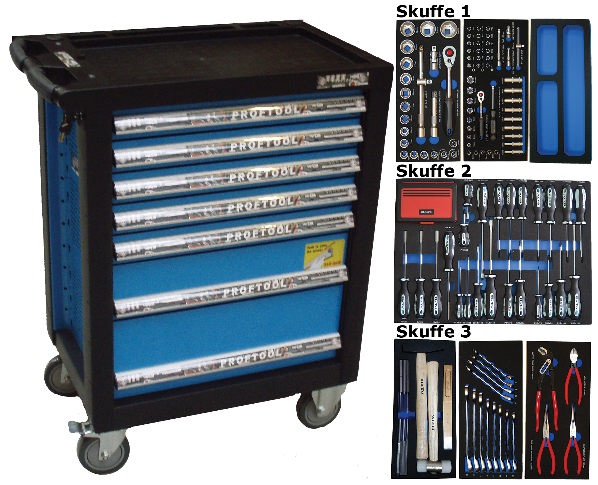 Værktøjsvogn 9137 med 225 værktøjsdele. Vogn med 7 skuffer – heraf 3 med værktøj i formstøbt EVA skum. Værktøjsdele: 1/2″ topnøglesæt 10-36 mm, 1/4″ topnøglesæt 4-14 mm, skruetrækkersæt, hammersæt med mejsel og dorne, ringøglesæt 8-19 mm og tangsæt.