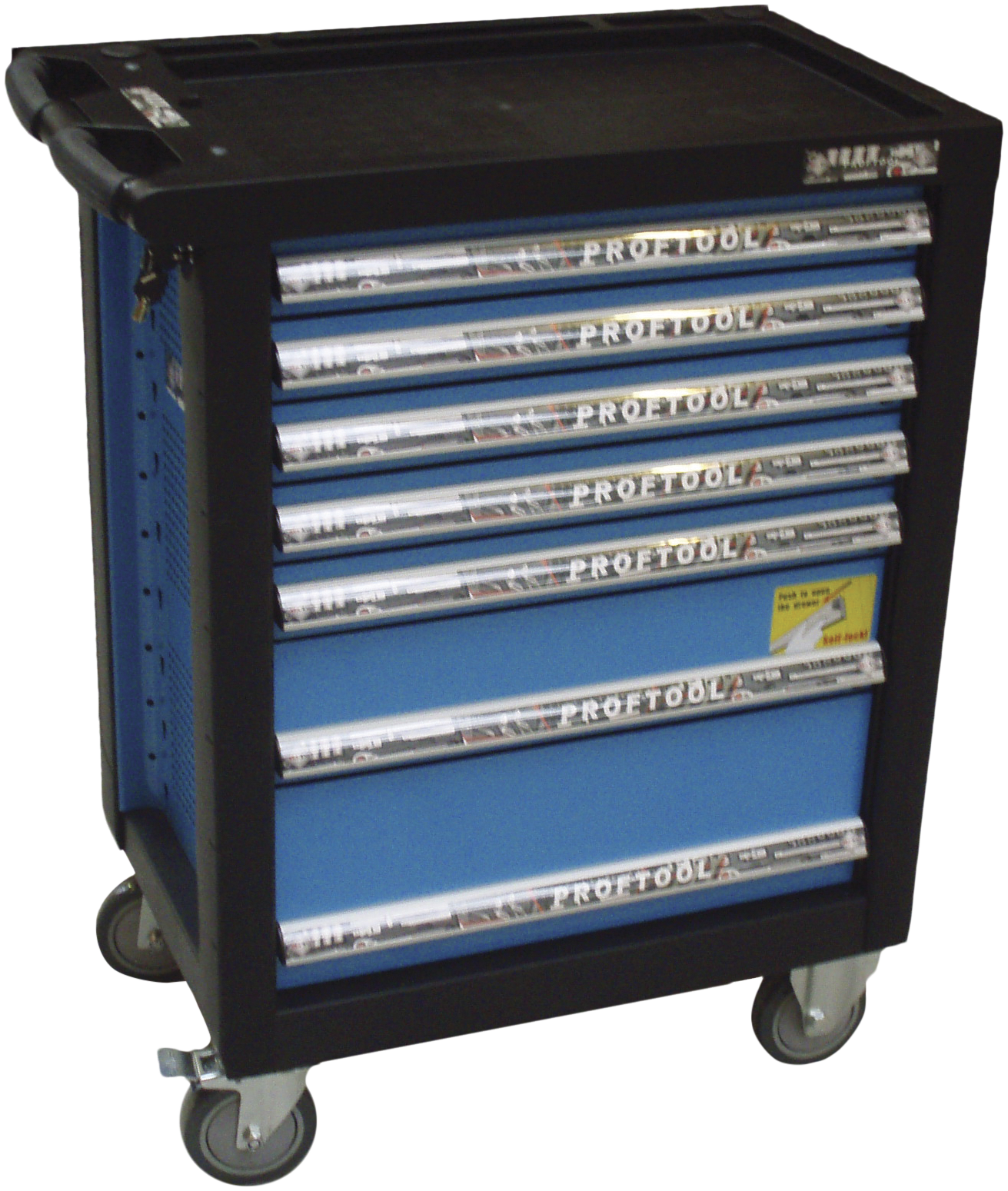 Værktøjsvogn med hjul og syv skuffer: fem små (indv. mål B534 × D390 × H57 mm), en mellem (indv. mål B534 × D390 × H127 mm) og en stor (indv. mål B534 × D398 × H196 mm). Bæreevne: lille skuffe 25 kg, mellem og stor skuffe 35 kg – vogn totalt 400 kg.
