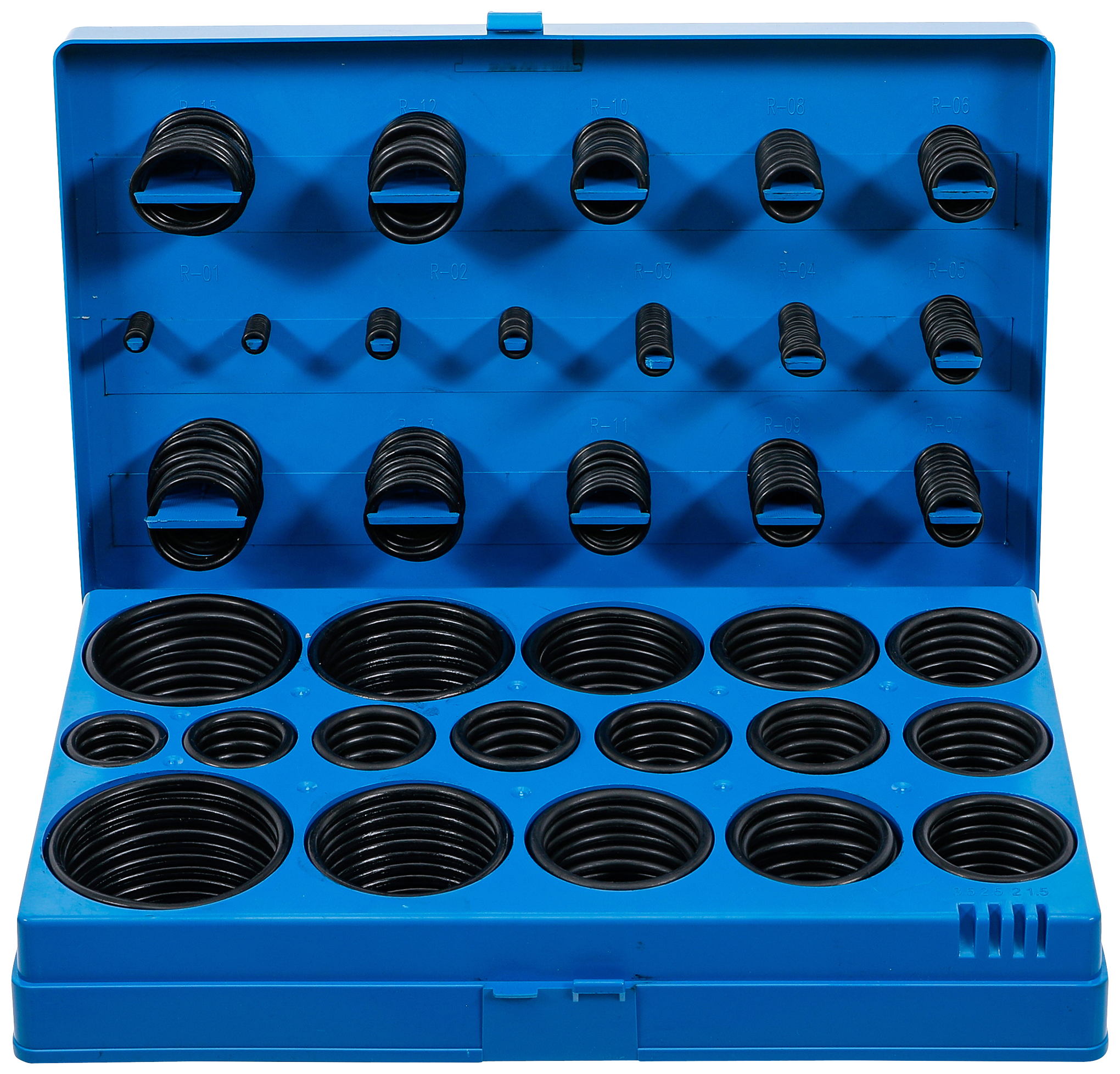 O-ringssortiment med 419 dele: 32 forskellige størrelser fra 3-50 mm. Indhold: 20× ø3 mm (styrke 1,5 mm), 20× ø4,5 mm (styrke 2 mm), 18× ø5 mm (styrke 2 mm), 23× ø7 mm (styrke 1,5 mm), 23× ø10 mm (styrke 1,5 mm), 23× ø13 mm (styrke 1,5 mm), 14× ø10 mm (styrke 2,5 mm), 13× ø11 mm (styrke 2,5 mm), 14× ø13 mm (styrke 2,5 mm), 13× ø14 mm (styrke 2,5 mm), 14× ø16 mm (styrke 2,5 mm), 14× ø18 mm (styrke 2,5 mm), 13× ø19 mm (styrke 2,5 mm), 14× ø21 mm (styrke 2,5 mm), 13× ø22 mm (styrke 2,5 mm), 10× ø18 mm (styrke 3,5 mm), 10× ø20 mm (styrke 3,5 mm), 10× ø22 mm (styrke 3,5 mm), 10× ø23,5 mm (styrke 3,5 mm), 10× ø25 mm (styrke 3,5 mm), 10× ø26,5 mm (styrke 3,5 mm), 10× ø28 mm (styrke 3,5 mm), 10× ø30 mm (styrke 3,5 mm), 10× ø31 mm (styrke 3,5 mm), 10× ø33 mm (styrke 3,5 mm), 10× ø34,5 mm (styrke 3,5 mm), 10× ø36 mm (styrke 3,5 mm), 10× ø38 mm (styrke 3,5 mm), 10× ø41 mm (styrke 3,5 mm), 10× ø44 mm (styrke 3,5 mm), 10× ø47 mm (styrke 3,5 mm), og 10× ø50 mm (styrke 3,5 mm). Nb ikke egnet til drikkevand. Emballage egnet til vægophæng.