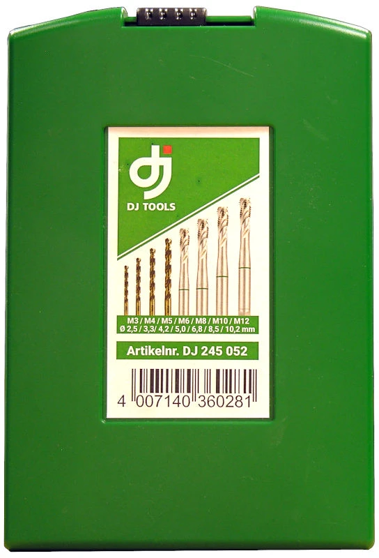 DJ TOOLS bor-/tapsæt HSS-Co5 med 7 spiraltappe 35° HSSE M3, M4, M5, M6, M8, M10, M12 mm samt tilhørende gevindbor HSS Co5 Ø2,5 / 3,2 / 4,2 / 5,0 / 6,8 / 8,5 / 10,2 mm i stålkassette. Maskinsnittappe af koboltlegeret højpræstations-hurtigstål. På grund af den større varmehårdheds bestandighed opnås en længere standtid. Til gennemgangsgevind og bundhulsgevind i ulegeret og legeret stål op til 1000 N/mm² styrke. Gevindet bliver skåret i en arbejdsgang.
