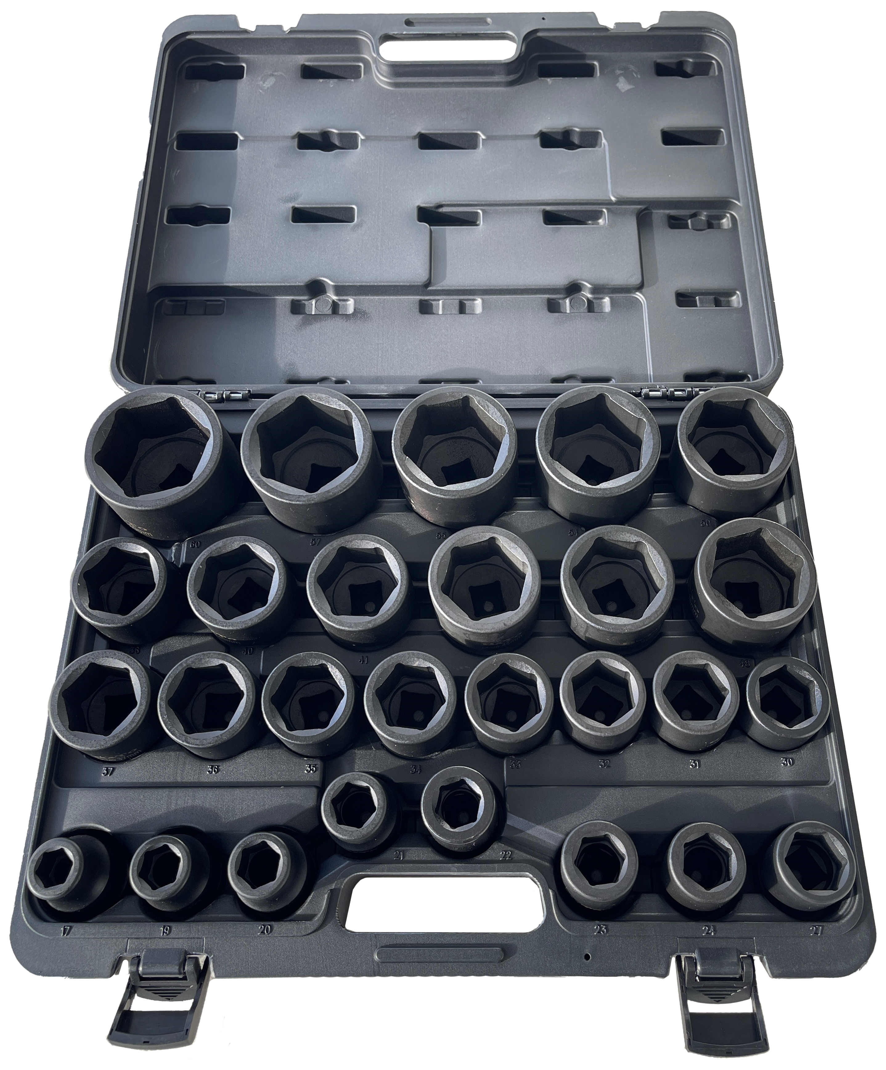 3/4″ krafttopsæt med 27 dele fra 17-60 mm. Indeholder: 17-19-20-21-22-23-24-27-30-31-32-33-34-36-37-38-40-41-45-46-48-50-54-55-57-60 mm.