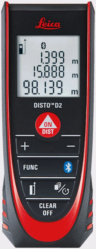 Leica Disto D2 afstandsmåler med funktioner som addition og subtraktion samt areal, volumen beregninger og malerfunktion. Alle data kan overføres via Bluetooth. Hukommelse for 10 målinger. Rækkevidde fra 0,05 til 100 mtr. Nøjagtighed ±1,5 mm. IP54.