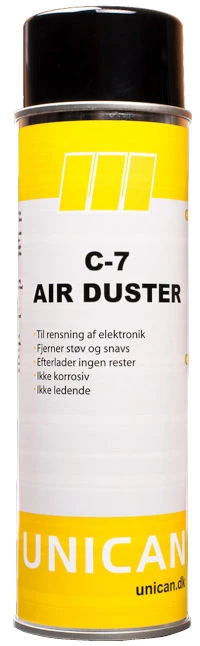 Anvendelse: C-7 Air Duster anvendes bedst ved at holde dåsen lodret. Det anbefales ikke at bruge produktet på hovedet eller i vandret position for at undgå beskadigelse af enheden. Hvis der ønskes et ubrandbart produkt, kan Unican C-9 Power Booster være et godt alternativ.