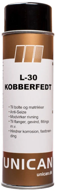 Anvendelse: Ved montageopgaver sprayes L-30 Kobberfedt på bolt og møtrik. Når møtrikken spændes, forhindrer L-30 både gevindrivning og rustdannelse, samtidig med at den fungerer som en fremragende beskyttelse mod fastbrænding.