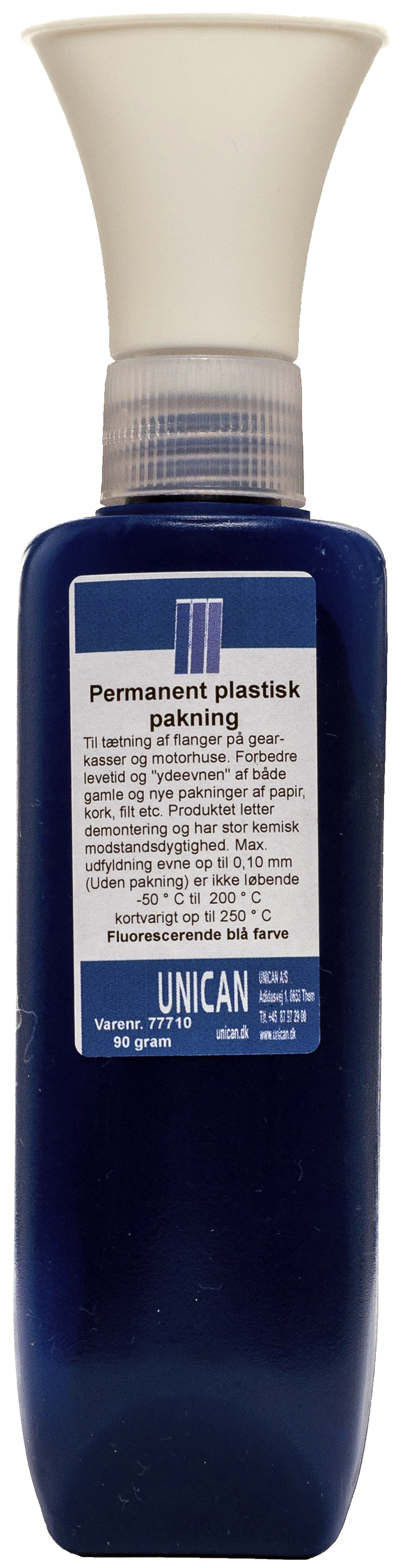 Unican perm. plastisk pakning indeholder ingen opløsningsmidler og muliggør øjeblikkelig samling. Til tætning af flanger på maskiner, gearkasser og motorhuse. Forbedrer levetid og “ydeevnen” af både gamle og nye pakninger fremstillet af papir, kork, filt osv. Indeholder ingen opløsningsmidler og er lugtfri. Unican perm. plastisk pakning har meget god modstandsdygtighed overfor de fleste mineralske olier, ether, kølervæskeblandinger på basis af metanol og glykol, frostvæsker, petroleum, fluorcarbon kølemidler osv. Maks. udfyldningsevne op til 0,10 mm (uden pakning). Produktet løber ikke og kan anvendes på lodrette flader. Temperatur modstandsdygtig fra -50°C til +200°C kortvarigt op til 250°C. Produktet kompenserer for fabrikationsfejl såsom skævheder og ridser. Giver også mulighed for præcis montering og konstruktion med lave tolerancer. Hindrer unødig overspænding under montage og er ikke-ætsende. Produktet indeholder ingen stoffer, der påvirker lakering (fx silikone). Fluorescerende blå farve.
