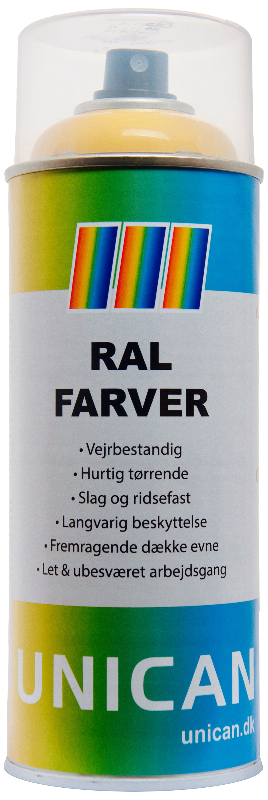 Unican RAL1023 trafikgul spraymaling er Vejrbestandig, hurtigtørrende RAL-farve spraymaling med særdeles god dækkeevne samt slag- og ridsefaste egenskaber for en langvarig beskyttelse. RAL-farve er yderst velegnet til at give en flot og beskyttende finish på alle former for maskiner, konstruktioner og andet udstyr. RAL-farven kan også bruges som opmærkningsspray på værktøj eller andet, som ønskes markeret. For bedste resultat anvendes Unican P-55 Grå Primer inden påførelse af RAL-farven. Rengør overfladen for fedt og snavs, ryst dåsen omhyggeligt og påfør RALfarven i en afstand af 25-30 cm. Hvis tykkere lag ønskes, kan nyt lag påføres efter ca. 5 minutter. Unican RAL1023 trafikgul spraymaling kan anvendes udendørs eller i et tilstrækkeligt gennemluftet område. Det optimale resultat opnås ved en temperatur mellem 10-25°C og en fugtighedsgrad, der ikke er for høj – helst under 60 %. Rens dysen efter brug ved at spraye 2-3 sekunder med dåsen vendt på hovedet. Fås i flere farver.