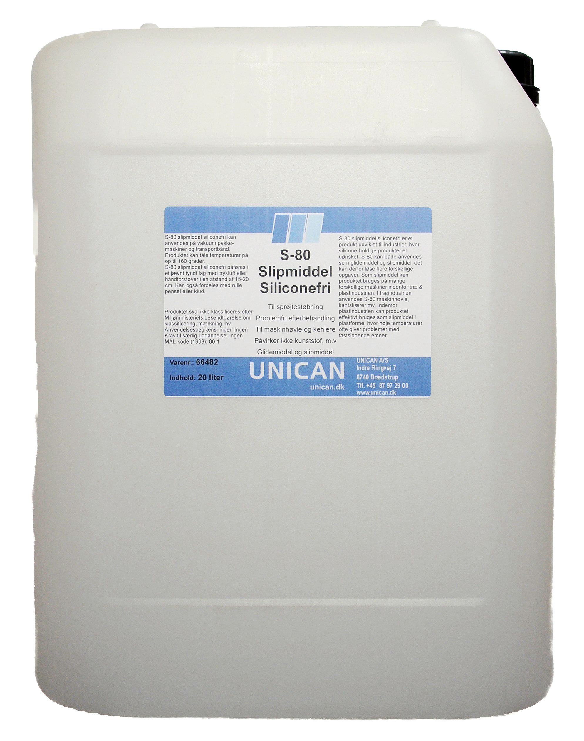 Unican S-80 slipmiddel 20ltr udviklet til industrier, hvor silikoneholdige produkter er uønsket. S-80 silikonefri slipmiddel kan både anvendes som glidemiddel og slipmiddel og kan derfor løse flere forskellige opgaver. Som slipmiddel kan produktet bruges på mange forskellige maskiner indenfor træ og plastindustrien. I træindustrien anvendes S-80 på maskinhøvle, kantskærer mv. Indenfor plastindustrien kan produktet effektivt bruges som slipmiddel i plastforme, hvor høje temperaturer ofte giver problemer med fastsiddende emner. Unican S-80 slipmiddel 20ltr kan også bruges på vakuumpakkemaskiner og transportbånd. Produktet kan tåle temperaturer på op til +160°C. S-80 silikonefri slipmiddel påføres i et jævnt tyndt lag med trykluft eller håndforstøver i en afstand af 15-20 cm. Kan også fordeles med rulle, pensel eller klud. Produktet skal ikke klassificeres efter Miljøministeriets bekendtgørelse om klassificering, mærkning mv. Fås i flere varianter.