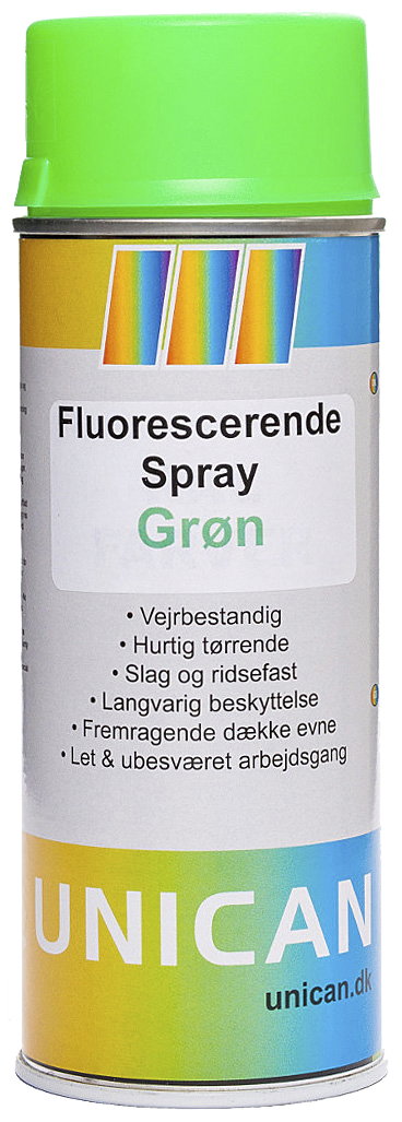 Unican spray fluorescerende grøn med fremragende vedhæftning på både behandlede og ubehandlede overflader. Hæfter på træ, metal (herunder aluminium), beton/sten og en del plasttyper. Produktet er opbygget på en nitro-cellulose lak, som er støvtør efter 5 til 10 min. Unican spray fluorescerende grøn er helt tør og kan overmales efter ca 2 timer under normale forhold. Hvis der skal opnås et optimalt resultat bør overfladen primes med en lys primer. Produktet er varmeresistent til ca. 110°C og har en dækkeevne på mellem 1,25 og 1,75 m². Fås i flere farver.