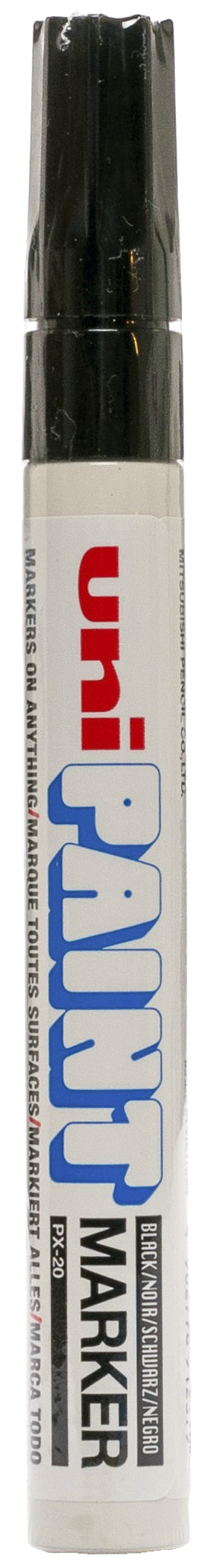 Unican Uni-paintmarker sort. Ryst pennen kraftigt med hætten påmonteret. Pres spidsen ned flere gange indtil malingen løber ned i spidsen. Efter endt brug påmonteres hætten igen for at undgå udtørring. Pennen kan leveres i hvid, gul, rød, sort, blå og grøn. Unican Uni-paintmarker sort er Ergonomisk design, permanent marker, industri kvalitet, vandresistent, hurtigtørrende.