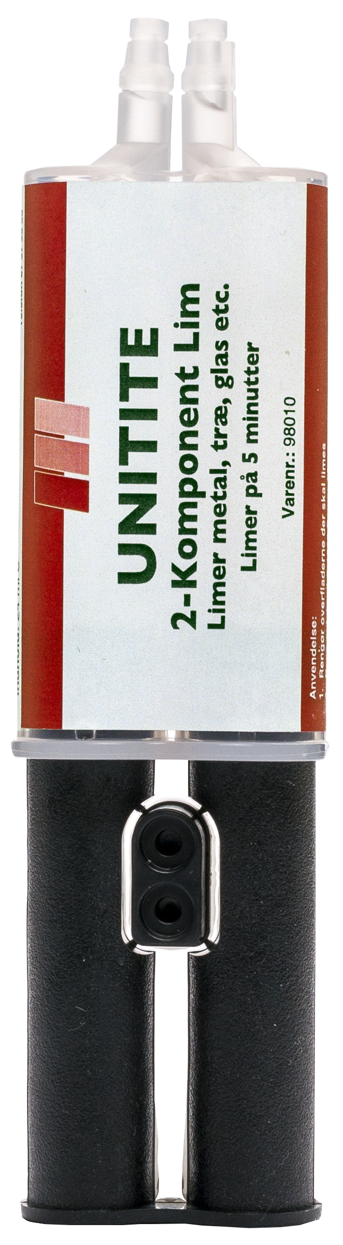 Unican UniTite 2-komp. lim 24ml Hurtig arbejdsgang, stor alsidighed og modstandsdygtighed, praktisk dobbelt sprøjte, limer aluminium, jern, metal, træ, sten, keramik, beton m.m. Unican UniTite 2-komp. lim 24ml er en klar/transparent stærk og hurtigt hærdende lim, der anvendes, hvor der stilles særlige krav til styrke og vandfasthed. Efter blanding kan produktet bearbejdes i ca. 3 minutter. Sættetiden er ca. 5 minutter og efter en time har produktet fuld funktions styrke. Til afrensning af emner kan UniCan C-1000 Power Cleaner anbefales.