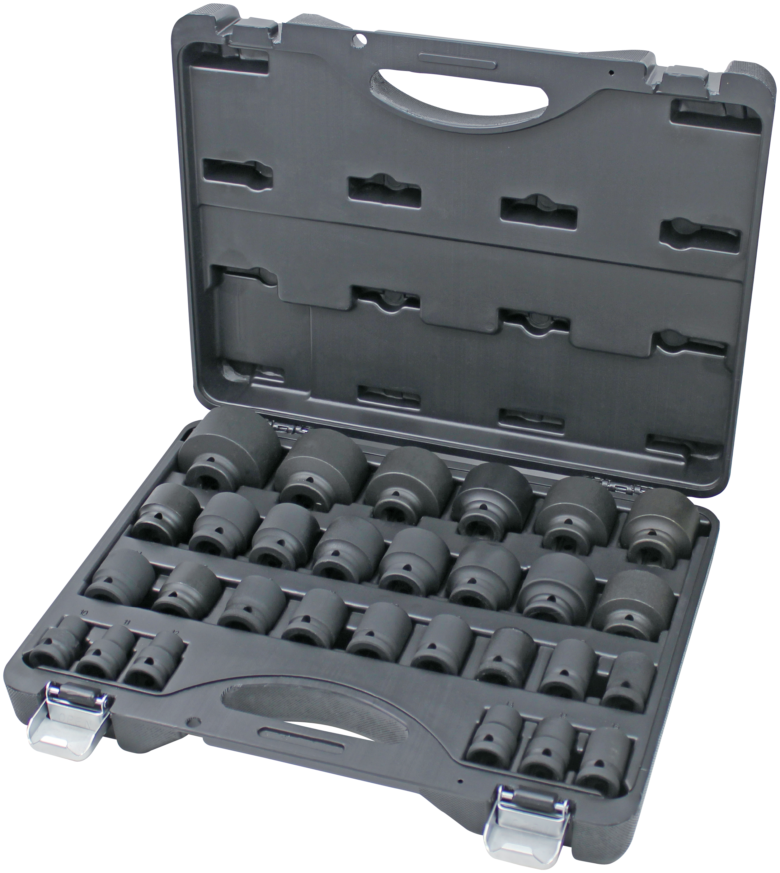 1/2″ krafttopsæt med 29 dele. Indeholder korte toppe i dimensionerne: 10-11-12-13-14-15-16-17-18-19-20-21-22-23-24-25-26-27-28-29-30-32-33-34-35-36-38-41-46 mm. Leveres i praktisk kuffert.