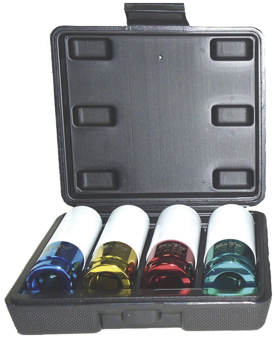Auto-krafttopsæt med 4 dele. 1/2″ 4kt krafttoppe med 6kt og plastbeskytter til alufælge. Sættet indeholder: 17-19-21-22 mm og leveres i praktisk plastboks.