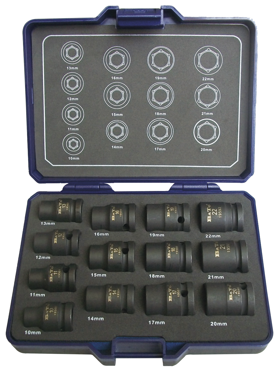 Krafttopsæt med 13 dele. Korte 1/2″ kraftoppe med magnet. Sættet indeholder: 10-11-12-13-14-15-16-17-18-19-20-21-22 mm. Leveres i plastboks.